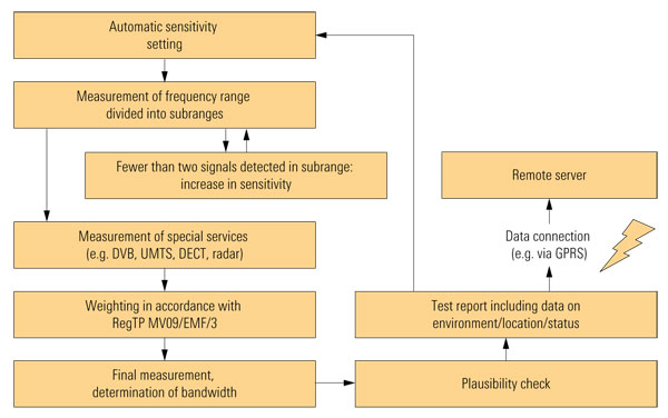 由于天線之間可以組合(相互之間、與地面之間已解耦,低頻范圍為全向環(huán)形天線,高頻范圍為全向電場天線),因而設(shè)備不必在測試現(xiàn)場進(jìn)行校準(zhǔn)。R&S? ESPI 測試接收機(jī)負(fù)責(zé)執(zhí)行測量,由于結(jié)合使用了預(yù)選器和前置放大器,因而可同時(shí)檢測強(qiáng)、弱信號。測量序列依靠 R&S? RFEX EMF 軟件的特殊功能處理,該軟件是成熟的便攜式電磁場測量系統(tǒng)R&S? TS-EMF的一部分。測量和分析由一系列步驟組成,并可不斷地重復(fù)(如圖所示)。儀器在測量整個(gè)頻率范圍之前,首先自動(dòng)地調(diào)整靈敏度以防止發(fā)生過載,各頻率子范圍可選擇不同的設(shè)置。為了確保各子頻率信號的測量,必要時(shí)可提高靈敏度重新進(jìn)行測量。為了準(zhǔn)確地對此類復(fù)雜信號進(jìn)行加權(quán)處理,需對重新定義的無線電業(yè)務(wù)(具有合適的帶寬和特定設(shè)置)進(jìn)行測量。信號經(jīng)評估和數(shù)據(jù)精簡處理后通過帶寬檢查其合理性,測量結(jié)果會(huì)隨同環(huán)境和系統(tǒng)狀態(tài)數(shù)據(jù)一并發(fā)送,后續(xù)詳細(xì)分析時(shí)需要的中間步驟和原始數(shù)據(jù)則可以存儲(chǔ)在本地硬盤上