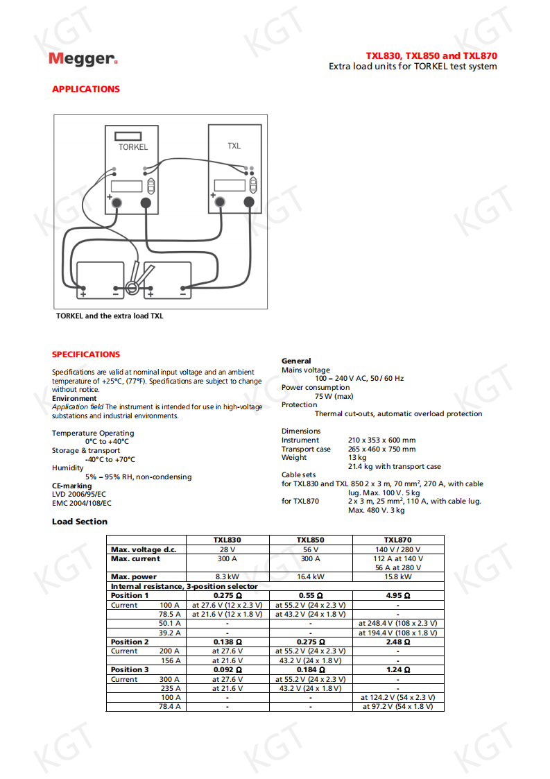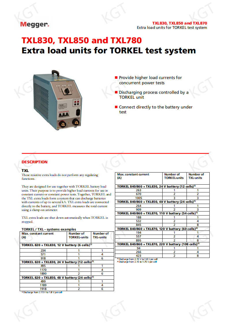 通過 TORKEL 設備控制放電過程它的設計是與 TORKEL 電池負載測試儀一同使用。其用途是在恒定電流或恒定功率測試時提供較高的負載電流。TORKEL 和 TXL 額外負載設備共同組成能夠對高達數千安的電流的蓄電池進行放電的系統。TXL 額外負載設備直接與蓄電池相連,TORKEL 利用鉗式安培計測量總電流。