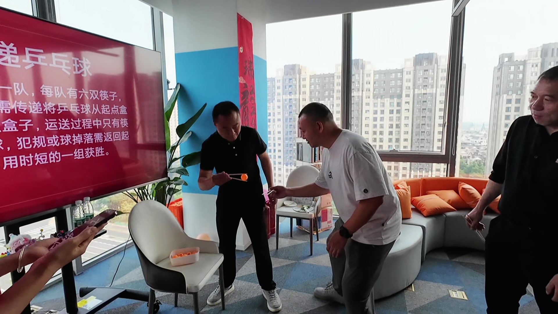 *先上場的是男生隊,雖然看起來很簡單,但真正操作起來卻充滿了挑戰。隨著游戲開始,現場氛圍變得緊張起來,每個人都全神貫注,手握筷子,眼神專注地盯著那顆小小的乒乓球。