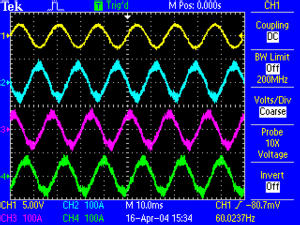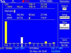 為在AC線路電壓上進行測量及檢查其對電源失真系統的影響,電源分析應用軟件顯示了直到50階諧波的諧波成分,提供了相位、無功功耗和功率因數測量功能。通過4通道TPS2014或TPS2024,您可以查看三相電壓或電流。