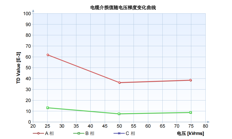★根據(jù)電纜介損測(cè)試結(jié)果,得到電纜介損值隨電壓梯度變化曲線。可見A相和B相曲線呈“√”號(hào)形狀,是典型的受潮特征變向。且A相進(jìn)水情況比B相嚴(yán)重。