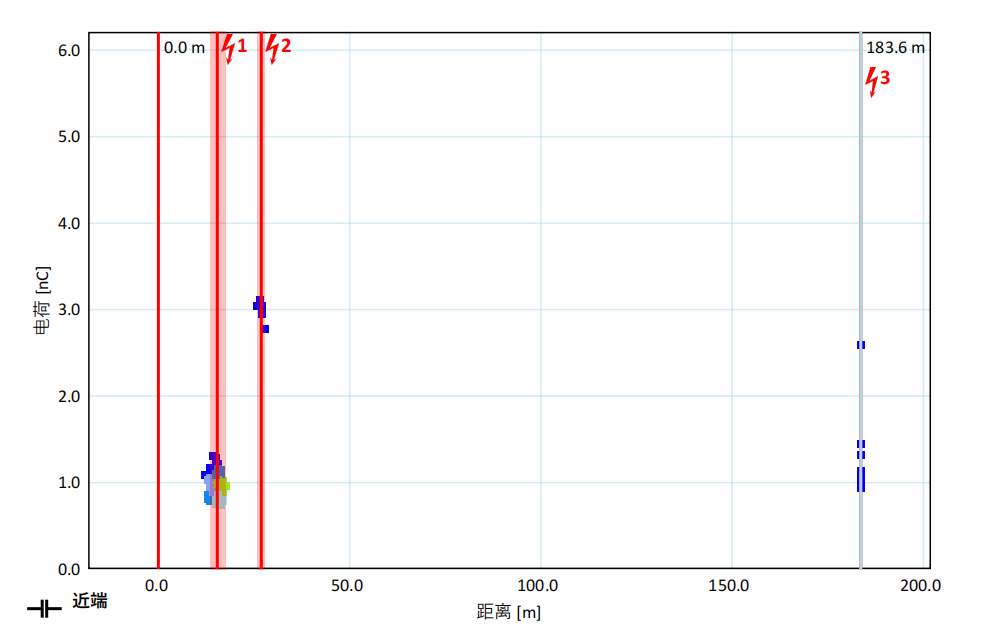 ★ A相測(cè)試電壓加到1.5U0時(shí),未發(fā)現(xiàn)放電情況。B相測(cè)出三個(gè)局放信號(hào),分別對(duì)應(yīng)15.4m,26.9m和183.6m。考慮到延長(zhǎng)線的行波速度與正常的66kV電纜行波速度不一致,認(rèn)為本次三個(gè)放電電位分別為測(cè)試線和延長(zhǎng)線夾子對(duì)接處,延長(zhǎng)線夾子和電纜連接處,和電纜對(duì)端電纜頭。
