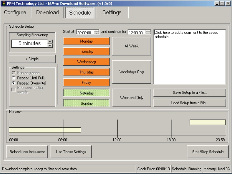 上圖是HTV-m日程表編輯器,用戶可以選擇需要測量的日期、開始時間以及持續(xù)時間。一旦設(shè)定好參數(shù),到預(yù)定時間,儀器會自動開機取樣,并記錄測量結(jié)果。導(dǎo)出的數(shù)據(jù)為csv表格格式,十分便于統(tǒng)計趨勢。