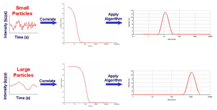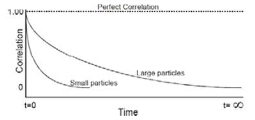 接收器在短時(shí)間內(nèi)多次測(cè)量某一位置光的強(qiáng)度,如果測(cè)量的是小顆粒那么光強(qiáng)度會(huì)很快變化,如果測(cè)量的是大顆粒那么光強(qiáng)變化會(huì)比較緩慢。在某個(gè)點(diǎn),如果時(shí)間t1和時(shí)間t2測(cè)量到的光強(qiáng)完全一樣,那么光強(qiáng)相關(guān)性為1(完全相關(guān)),如果測(cè)量到的光強(qiáng)完全不一樣,光強(qiáng)相關(guān)性為0(完全不相關(guān))。繪制出光強(qiáng)相關(guān)性隨時(shí)間變化的曲線,如下圖所示。