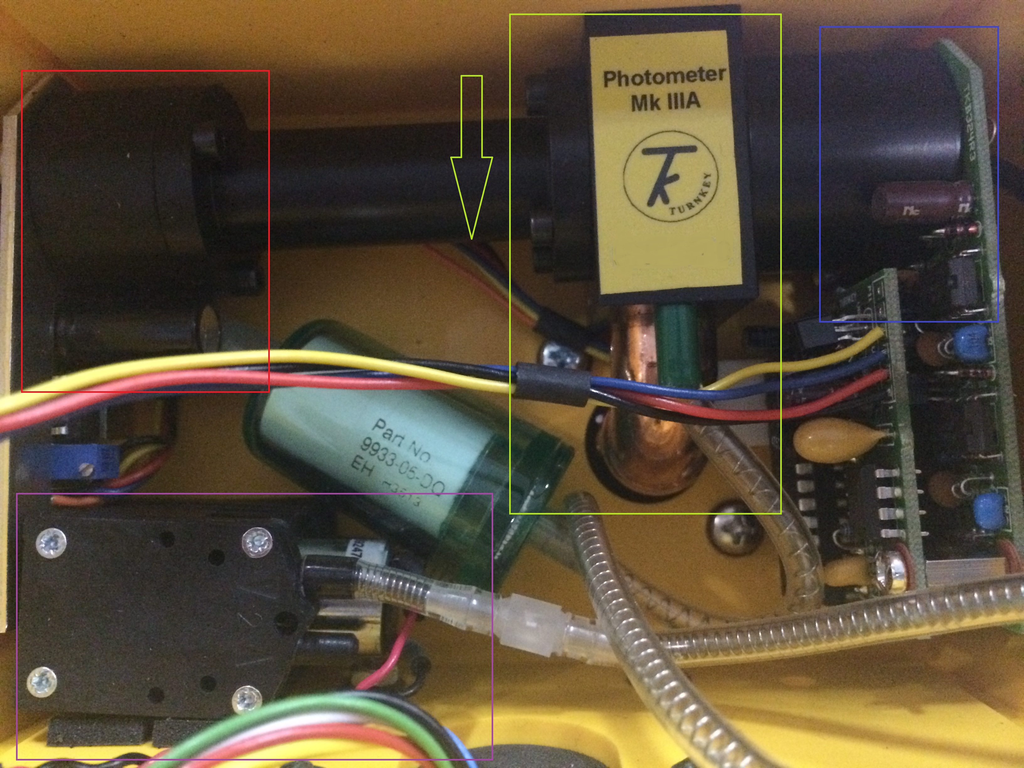以上*是光散射法測(cè)量顆粒物濃度的簡(jiǎn)單介紹,下面以Dustmate為例,介紹一下實(shí)際情況中激光器的工作方式。下圖所示是Dustmate的采樣和測(cè)量電路,圖中用四種不同顏色的方框分成了四個(gè)部分,其中紅色部分*是激光發(fā)生器,用于發(fā)出單波長(zhǎng)的激光,進(jìn)行散射光測(cè)量。綠色部分是儀器的氣體通路,從空氣中采集到的氣體沿箭頭方向進(jìn)入儀器,在激光器中把激光散射。紫色部分是采樣泵,提供抽力,吸入空氣。*后藍(lán)色部分是光的接收器,用于接收散射光,并把光強(qiáng)數(shù)據(jù)傳輸?shù)教幚砥髦杏?jì)算。