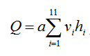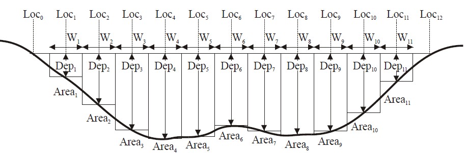 中間值法首先將河道分為等距的段落,圖示為W1-W11。使用流速計(jì)在每個(gè)段落的中心位置測(cè)量流速,流速測(cè)量方法根據(jù)上面的建議選擇。依次測(cè)量完11個(gè)段落進(jìn)行計(jì)算。表示為公式如下所示: