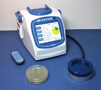 V100通過線纜給旋轉(zhuǎn)裂縫式、封閉環(huán)境式采樣器(R2S和RCG)的電動機供電,在采樣過程中電動機會帶動培養(yǎng)皿旋轉(zhuǎn),從而使通過裂縫的微生物均勻的分布在培養(yǎng)皿上。因為培養(yǎng)皿的旋轉(zhuǎn)速度是恒定的,所以用戶不但可以獲得均勻的樣品,也可以通過不同位置的菌落數(shù)量判斷微生物隨時間變化的情況。例如,采樣時間設(shè)定為360秒,R2S采樣器每秒旋轉(zhuǎn)1°,采樣完畢時培養(yǎng)皿旋轉(zhuǎn)一圈。如果在90°的位置發(fā)現(xiàn)菌落過多,則說明在第90秒時空氣中的微生物含量較高。